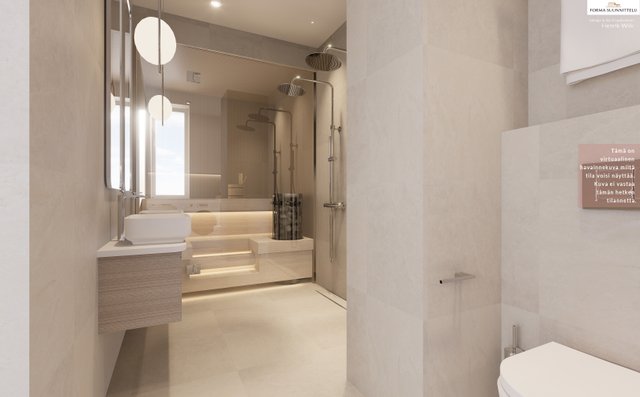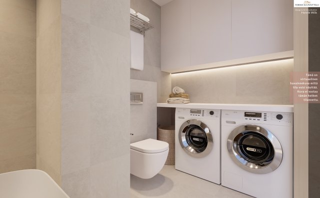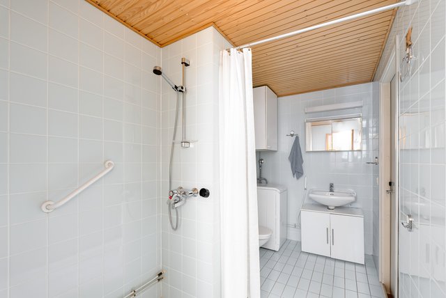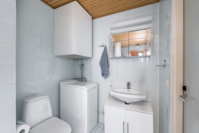 - WC-istuin, suihku, pesukoneliitäntä, lattialämmitys, ja peilikaappi