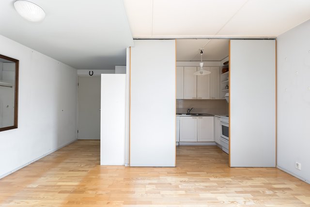 Tällä hetkellä asunto käsittää olohuoneen, liukuovin suljettavan keittiön, ruokailutilan, kaksi makuuhuonetta, kylpyhuoneen, saunan, eteisen ja lasitetun parvekkeen. Asunnon pinnat ovat alkuperäiset, mutta pohjaratkaisu tarjoaa erinomaisen pohjan päivitykselle – katso suunnittelijan visio, miltä koti asunto voisi näyttää uudistettuna!