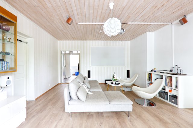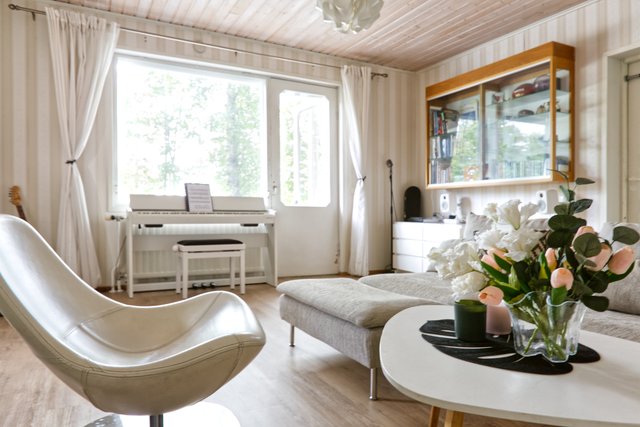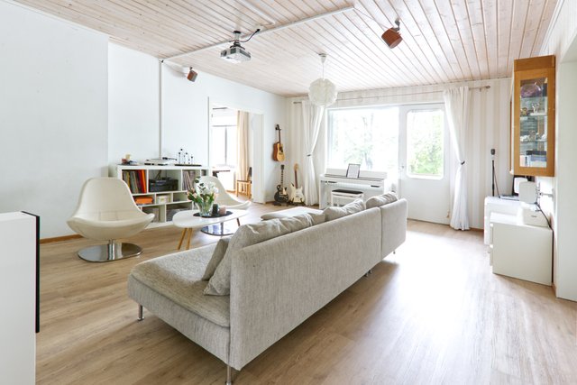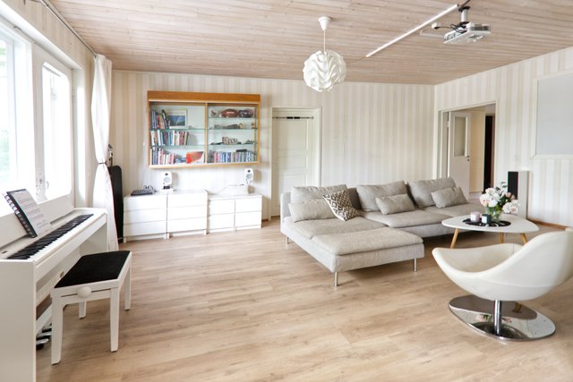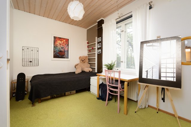 - Toisessa makuuhuoneessa laminaatti, jossa tekstiilipalamatto, toisessa laminaatti, yläkerrassa laminaatti