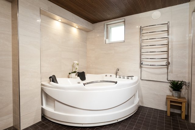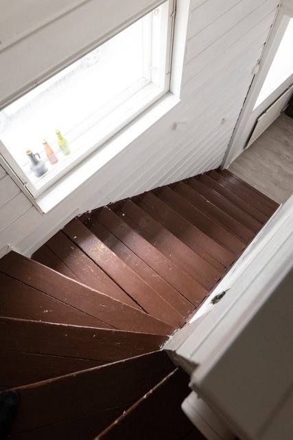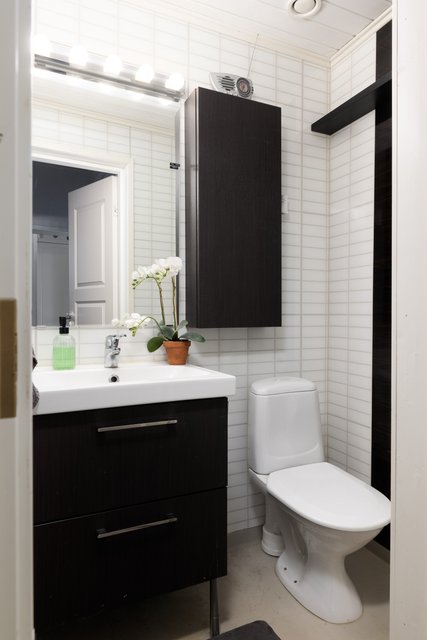 - Keskikerroksessa wc, lattia muovimattoa. Ylhäällä oma kylpyhuone, missä wc, laattalattia.