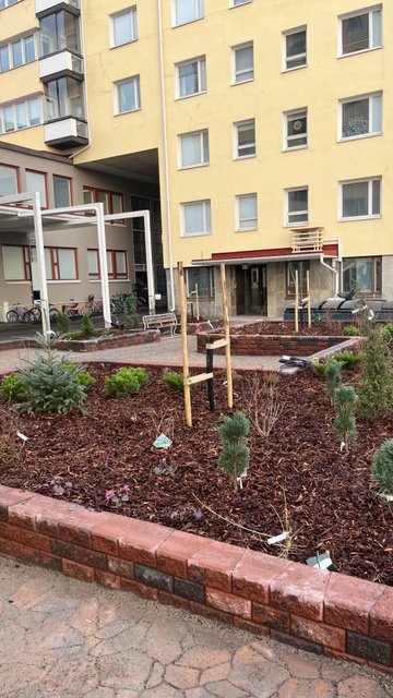 konesaumakatto maalattin. Sisäpihalle asennettiin 4 yhteislautauspaikkaa sähköautoille ja pihan muut