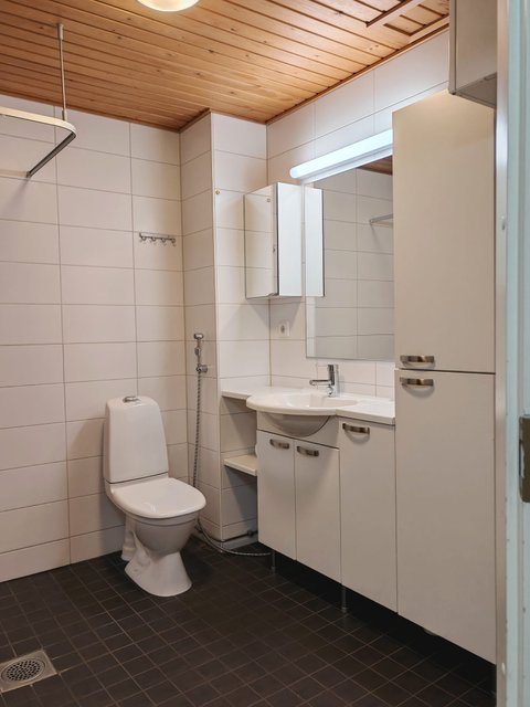 - WC-istuin, suihku, pesukoneliitäntä, lattialämmitys, peili, pesuallas, allaskaappi, ja bidee-suihku