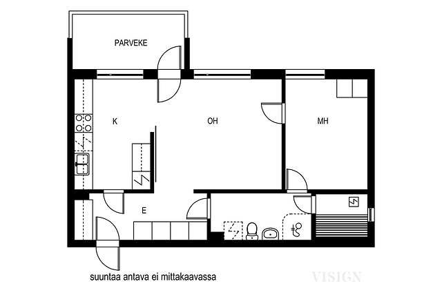 2 h, avokeittiö, kph/s, lasitettu parveke (Yj. 2 h+k+s)