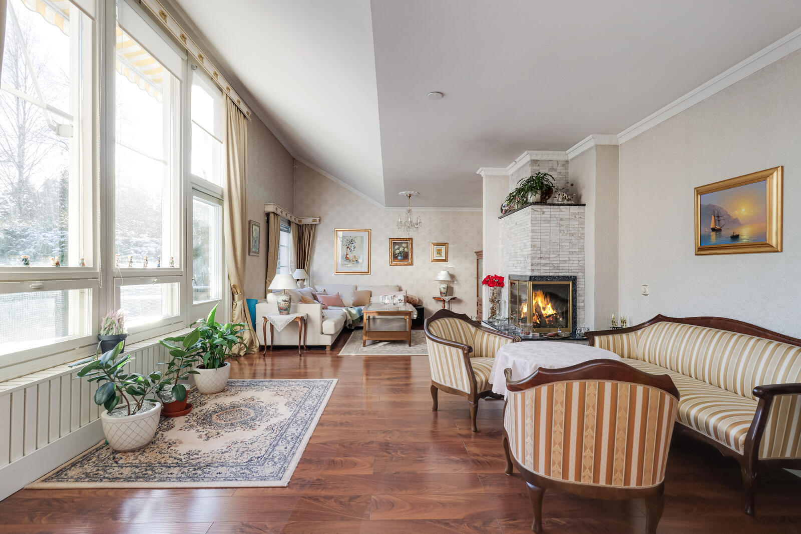 Olohuoneen normaalia korkeampi huonekorkeus ja terassille suuntautuvat isot ikkunat tuovat runsaasti valoa asuntoon. Olohuone on tilava ja se on mahdollista jakaa kahteen osaan tekemällä erillinen ruokailuhuone tai neljäs makuuhuone. Keittiö on tyylikäs ja käytännöllinen, tilaa on myös isolle ruokapöydälle.