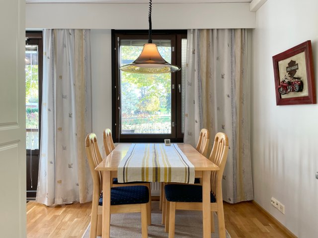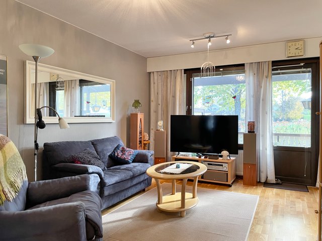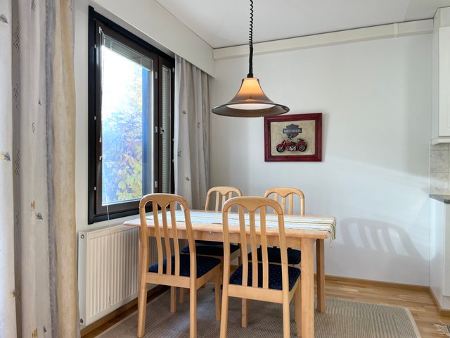 Käytännöllinen 59 m2 rivitalokaksio suojaisasti päättyvän kadun varrella, aivan Tiiriön palveluiden vieressä. Huoneiston jatkona on etelän suuntaan oleva valokatettu terassialue ja pieni takapiha, jotka aukeavat puistoon päin. Tässä vuonna 1998 valmistuneessa kaukolämpöyhtiössä on tehty muun muassa käyttövesiputkiremontti vuonna 2024, jonka yhteydessä remontoitiin asuntojen kylpyhuoneet, saunat ja wc:t. Huoneistolle kuuluu oma lämmin varasto sekä pistokkeellinen katospaikka autolle. Huoltoyhtiö hoitaa pihatyöt ympäri vuoden, ja hoitovastikkeeseen sisältyy lämmityksen lisäksi myös taloyhtiölaajakaista.