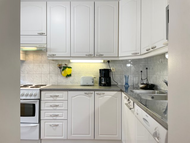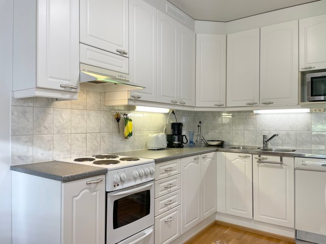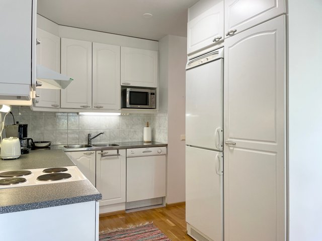 - Parkettilattia, seinät maalattu. Valkoiset kaapin ovet, harmaa laminaattitaso ja välitilassa vaalea laatta. Jääkaappipakastin, sähköliesi, liesituuletin ja astianpesukone (ei ole käytetty 10 vuoteen joten ei ole varmuutta toiminnasta).