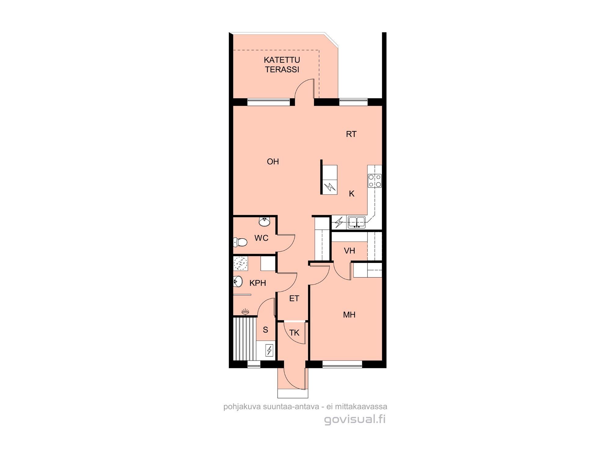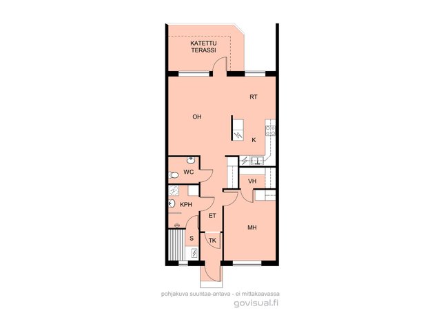 - Keittiö, olohuone ja terassi noin etelään puistoalueelle päin, makuuhuone noin pohjoiseen sisäpihalle päin.