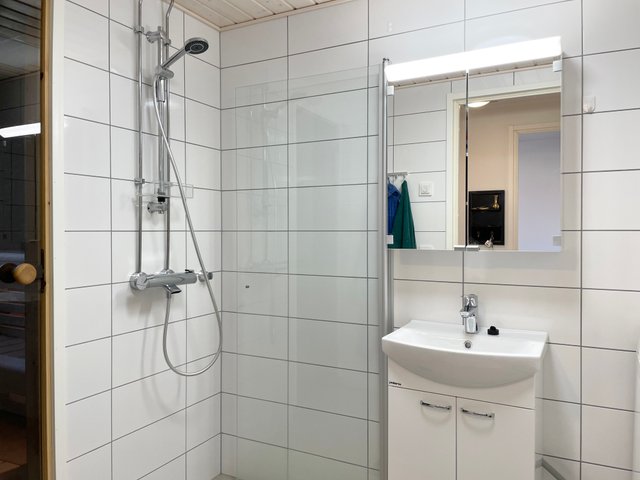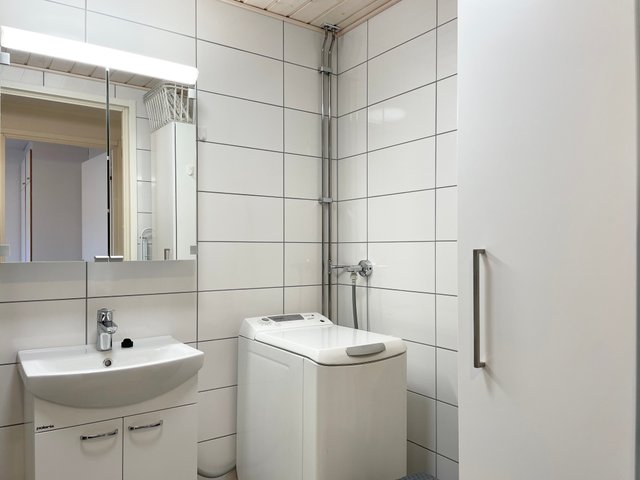 - Kylpyhuone remontoitu kokonaisuudessaan putkiremontin yhteydessä 2024. Lattia ja seinät laattaa. Peilikaappi, allaskaappi, korkea kaappi, varaus pesutornille, kääntyvä suihkuseinä ja suihku. Mukavuuslattialämmitys.