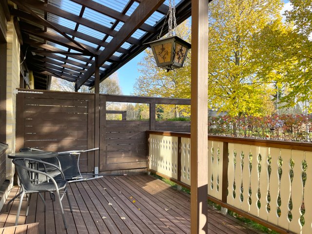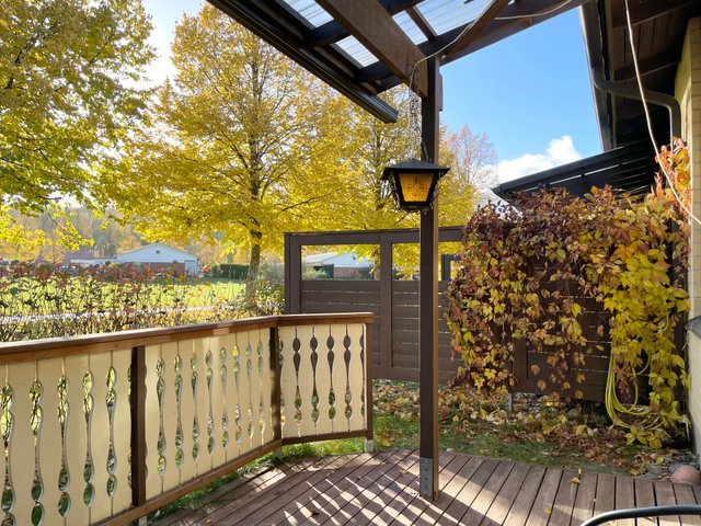 - Valokatettu terassi ja pieni piha-alue noin etelään puistoalueelle päin