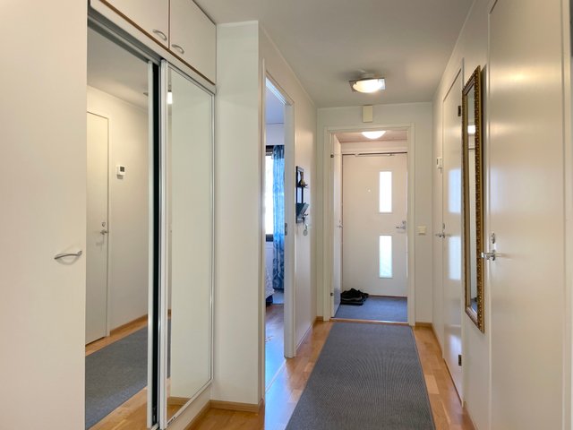 Sisäänkäynti asuntoon tapahtuu suojaisan sisäpihan puolelta tuulikaappiin, jossa on tilaa kengille ja esimerkiksi seinänaulakolle. Säilytystilaa löytyy eteiskäytävän isosta kiinteästä kaapistosta, johon on lisätty liukuovet.