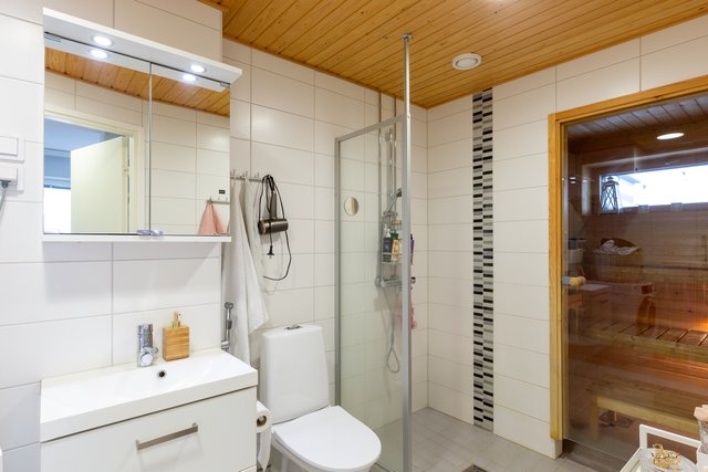 - WC-istuin, suihku, suihkuseinä, pesukoneliitäntä, peilikaappi, pesuallas, allaskaappi, ja bidee-suihku