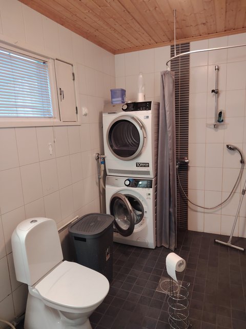 - WC-istuin, suihku, pesukoneliitäntä, pesuallas, ja lattialämmitys