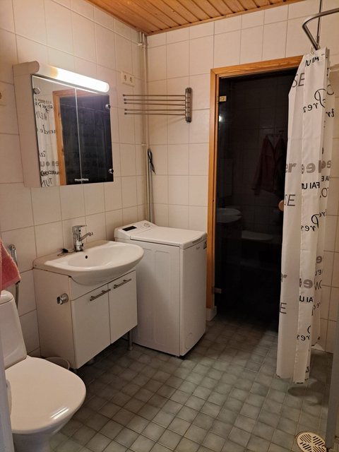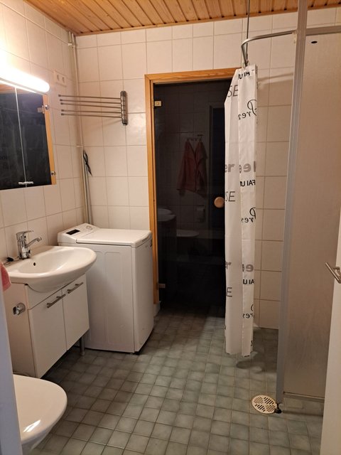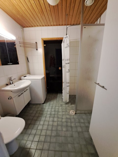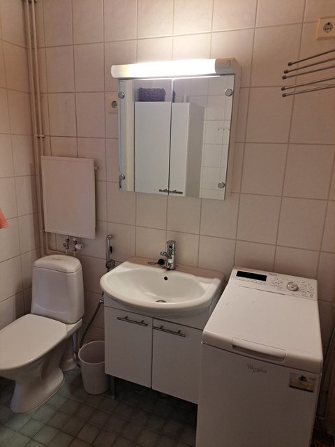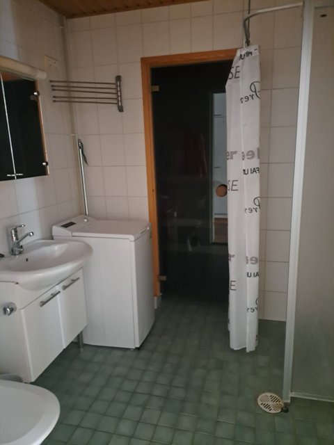 - WC-istuin, suihku, pesukoneliitäntä, lattialämmitys, peilikaappi, pesuallas, ja bidee-suihku