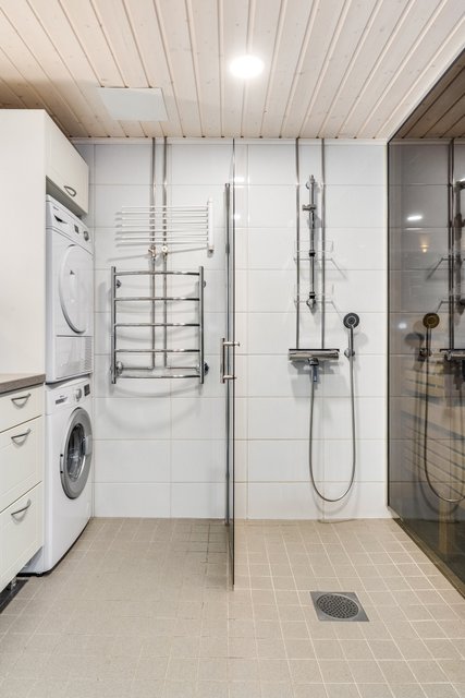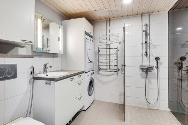 - Kylpyhuone ja sauna on remontoitu v. 2017. Varustus: Suihku, suihkuseinä, wc-istuin, pesukoneliitäntä, hana, allas, peilikaappi, allaskaapisto, lattialämmitys. Seinät: Kaakeli. Lattia: Laatta.