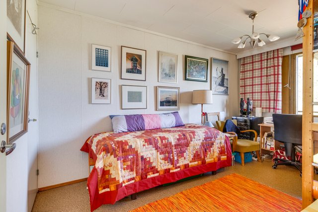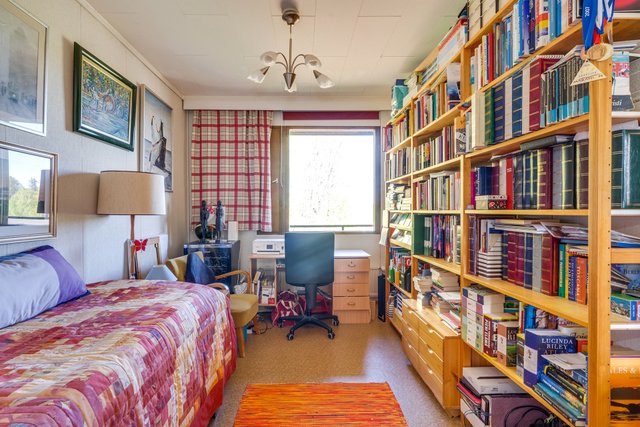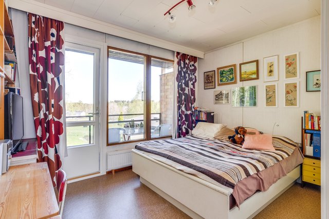 - Yhdestä makuuhuoneesta käynti parvekkeelle ja yhdessä makuuhuoneessa huoneiston toinen vaatehuone. Seinät: Tapetti. Lattia: Muovi.