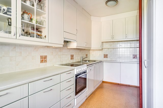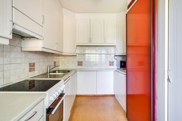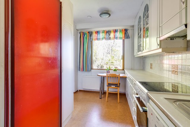 - Keittiö remontoitu 90- luvun lopulla. Paljon kaappi- ja laskutilaa. Varustus: Liesituuletin, uuni, hana, kaapisto, allas, astianpesukone, sähköliesi, huurre-kylmiö 90cm leveä. Seinät: Kaakeli / Maalattu. Lattia: Korkki.