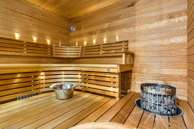- Varustus: Sähkökiuas. Seinät: Puu / Lasi. Lattia: Laatta.