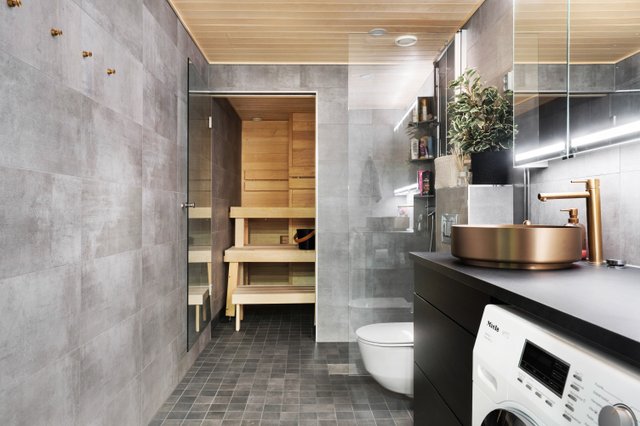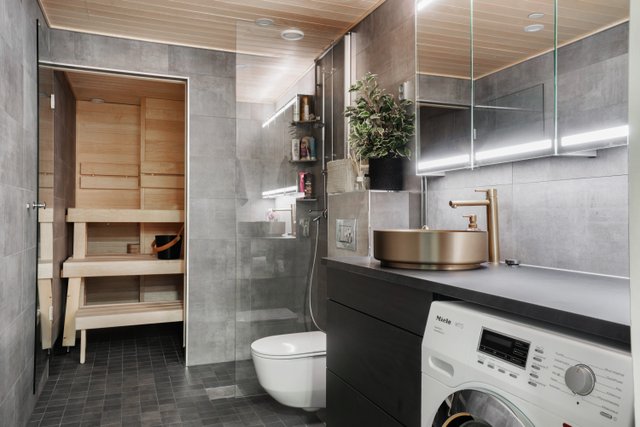 - WC-istuin, suihku, suihkuseinä, pesukoneliitäntä, peilikaappi, lattialämmitys, bidee-suihku, allaskaappi, ja pesuallas