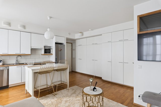 - Avokeittiö. Kaapit kalvopinnoitettu.Pöytä laminaatti tai muu vastaava. Kuvissa näkyvä saareke ei kuulu kauppaan, vaan on irrallinen huonekalu.