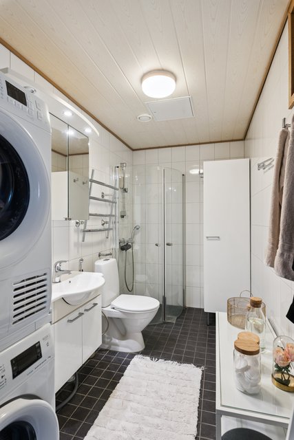 - Suihku, wc-istuin, pesukoneliitäntä, ja allaskaappi