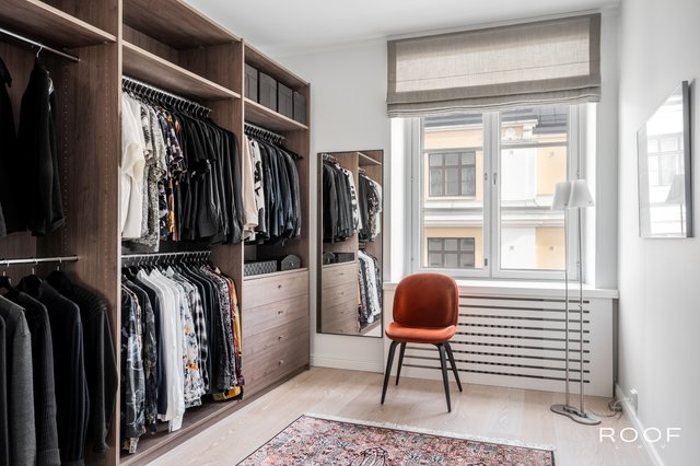 - Varustus: hyllyjä, vaatetankoja ja vetolaatikoita. Seinä: maali Lattiat: parketti Tila toimii tällä hetkellä vaatehuoneena, mutta muuntautuu helposti myös työ- ja vaatehuoneen yhdistelmäksi. Ikkunan ääreen mahtuu työpöytä.