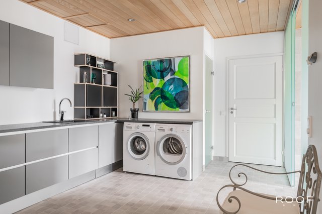 - Suuren kylpyhuoneen yhteydessä kodinhoitohuone Varustus: pesukoneliitäntä ja paikka pyykinpesutornille, paljon kaappitilaa ja laskutilaa, lattialämmitys. Seinämateriaali: Maali Lattiamateriaali: Laatta