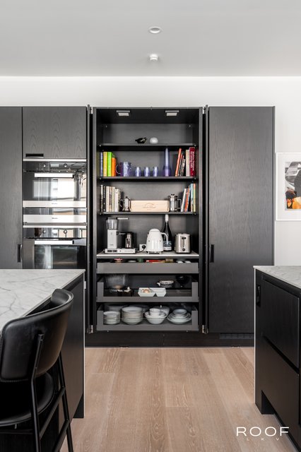- Puustellin keittiö Varustus Kodinkoneet ja laitteet: - Gaggenau induktioliesi - Gaggenau jääkaappi - AEG pakastin - Gaggenau astianpesukone - Miele uuni - Miele mikroaaltouuni (integroitu) - Miele lautaslämmitin - Faber liesituuletin kaukosäätimellä - Allas - Hana Kalusteet ja säilytys: - Kaapistot - Aamiaiskaappi Kaksi saareketta: - Toinen baarituoleilla istumista varten - Toinen kaapistoilla ja kahdella mQuvée -viinikaapilla Pinnat ja materiaalit: Työtasot, välitila ja saarekkeiden tasot kvartsia Seinämateriaali: - Välitila kvartsia - Muut seinäpinnat maalattuja - Kaapistojen yläpuolinen osa maalattu Lattiamateriaali: Parketti