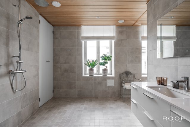 - Varustus: Kaksi suihkua, hana, allas, allaskaapisto, lattialämmitys Seinämateriaali: Laatta Lattiamateriaali: Laatta Pienempi kylpyhuone Varustus: Pesukoneliitäntä, suihku, wc-istuin, allas, allaskaappi, lattialämmitys, rättipatterivaraus. Seinämateriaali: Laatta Lattiamateriaali: Laatta