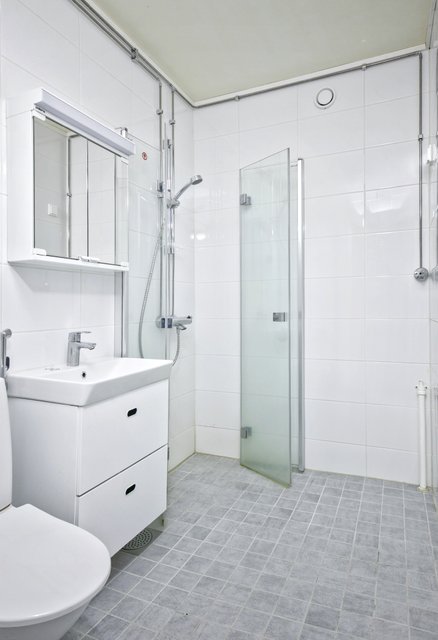 - WC-istuin, suihku, peilikaappi, ja pesuallas