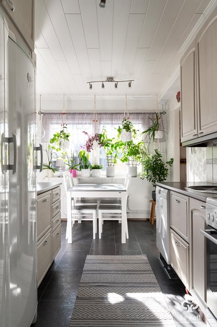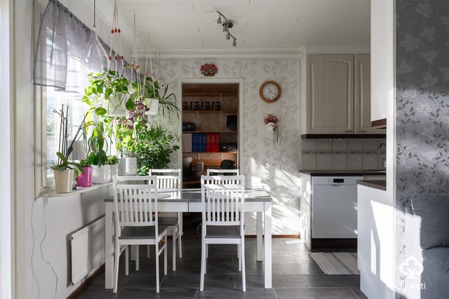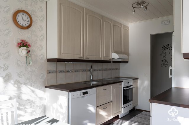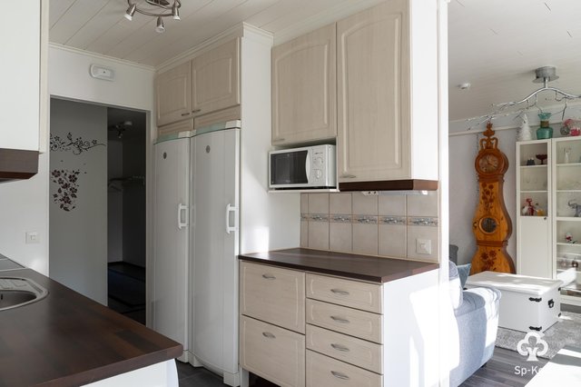 - Täyskorkeat jääkaappi ja pakastinkaappi, astianpesukone, keraaminen liesi, liesituuletin, kaapistot ja tasot. Välitila laatta, seinät maalattu, lattia laminaatti.
