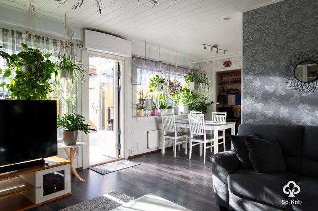 - Olohuoneesta kulku terassille, seinät maalattu/tapetoitu, lattia laminaatti.