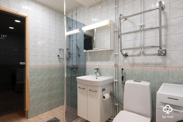 - Suihku, peilikaappi, allaskaappi, peili, pesukoneliitäntä, wc-istuin, pyyhekuivauspatteri, seinät ja lattia laatta.