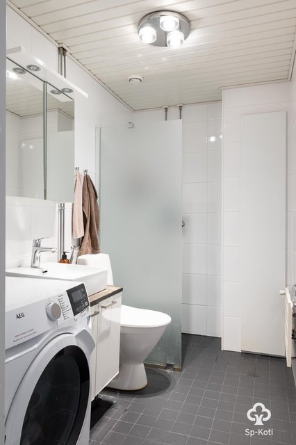 - Suihku, wc-istuin, pesukoneliitäntä, seinät ja lattia laatta, lattialämmitys.