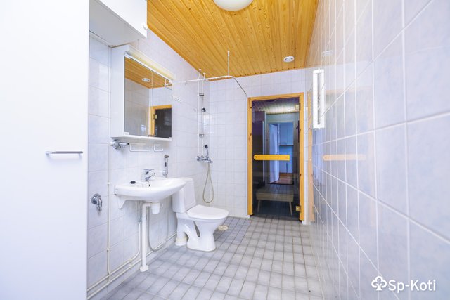 - WC-istuin, suihku, pesukoneliitäntä, lattialämmitys, peili, ja bidee-suihku