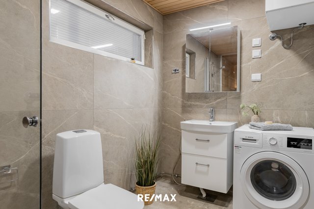 - WC-istuin, suihku, lattialämmitys, suihkuseinä, pesukoneliitäntä, peilikaappi, allaskaappi, pesuallas, ja bidee-suihku