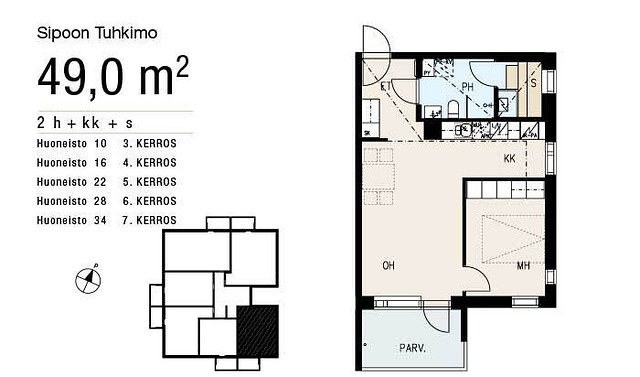 2 h, k, s +lasitettu parveke (yj:n mukaan 2h+kk+s)