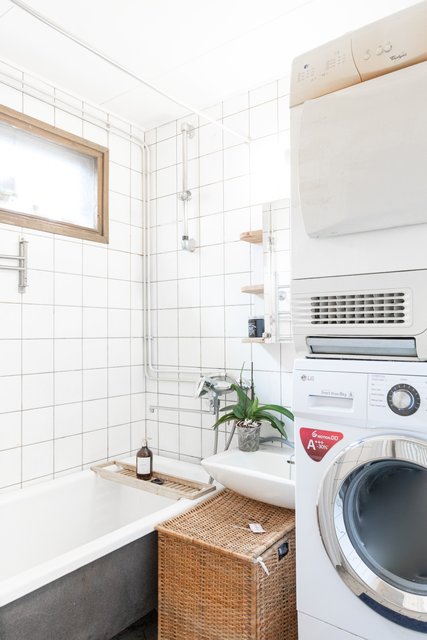 - Suihkuseinä, pesukoneliitäntä, ja suihku