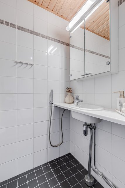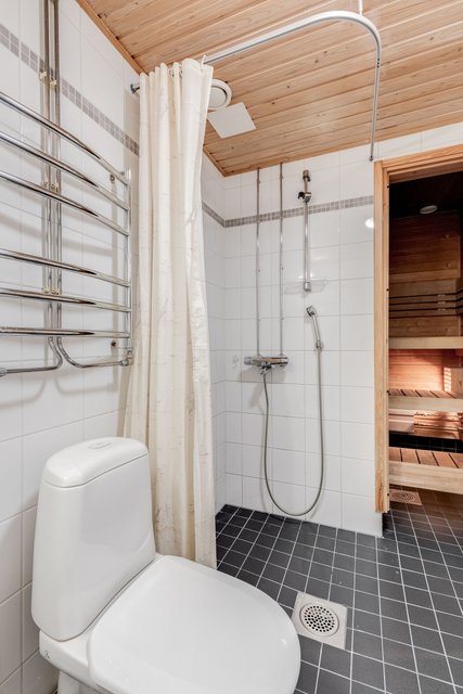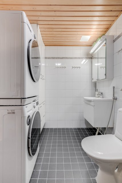 - Varustus: WC-istuin, suihku, peilikaappi, allaskaappi, pesuallas ja pesukoneliitäntä. Lattia: Laatta. Seinä: Kaakeli.