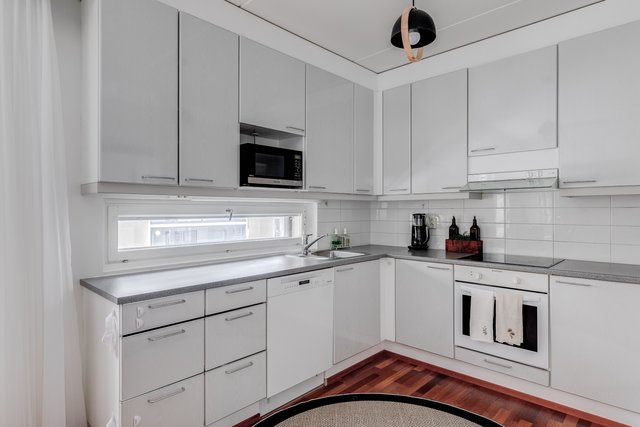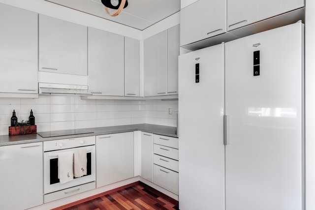 - Varustus: Astianpesukone, liestituuletin, jääkappi, erillinen pakastin, liesi ja uuni. Työtasot: Laminaatti. Seinä: Maali. Laattia: Parketti
