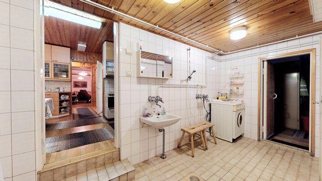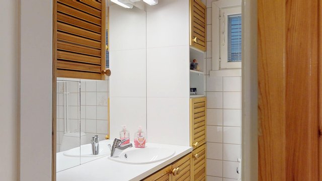 - Pesukoneliitäntä, peilikaappi, ja pesuallas