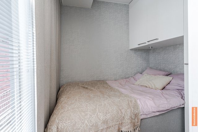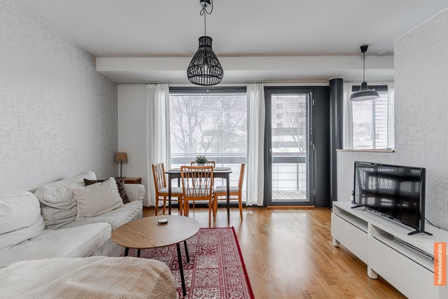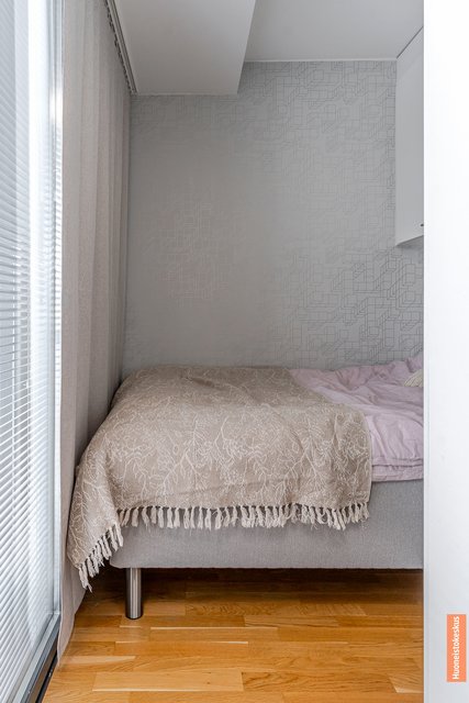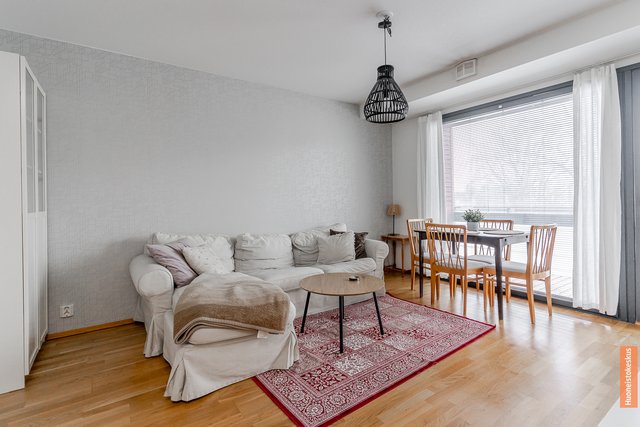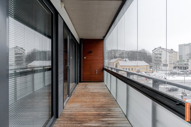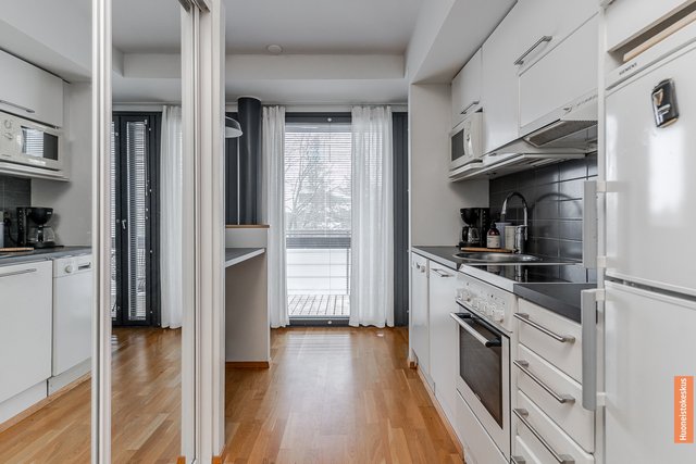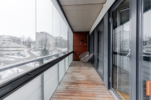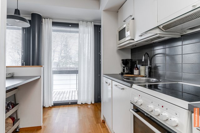 Asunnon pohjaratkaisu on toimiva, ja makuualkovi tuo lisää tilantuntua. Keittiö on varusteltu nykyaikaisesti, ja tilavassa kylpyhuoneessa on tilaa omalle pesukoneelle. Koko huoneiston levyisellä suurella parvekkeella voi nauttia aamukahvit rauhassa, sillä se on lasitettu.