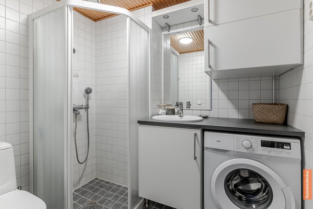 - WC-istuin, suihku, pesukoneliitäntä, ja peilikaappi