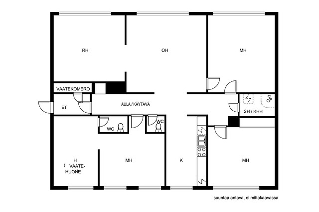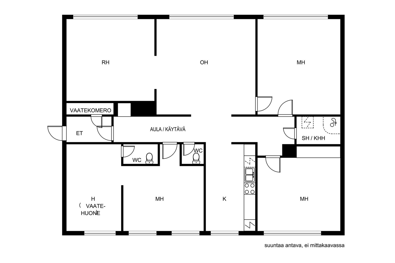 Korkea huonekorkeus, avarat ja valoisat tilat.