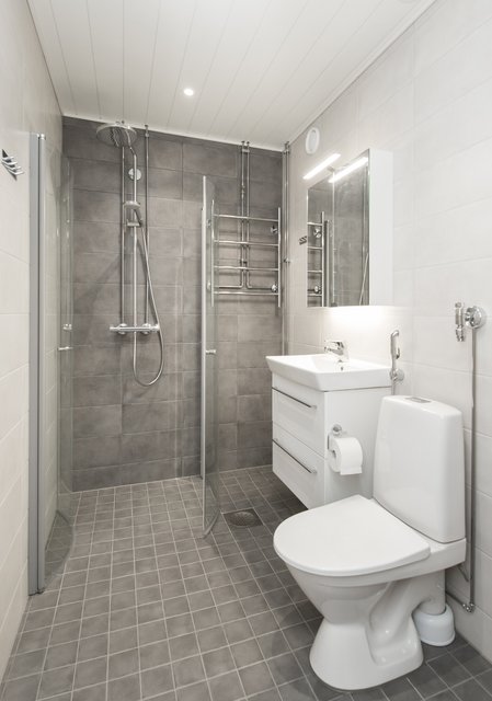 - WC-istuin, suihku, pesukoneliitäntä, peilikaappi, pesuallas, allaskaappi, bidee-suihku, ja suihkuseinä