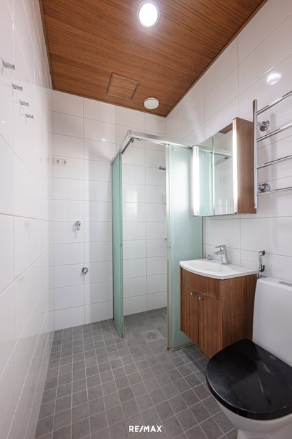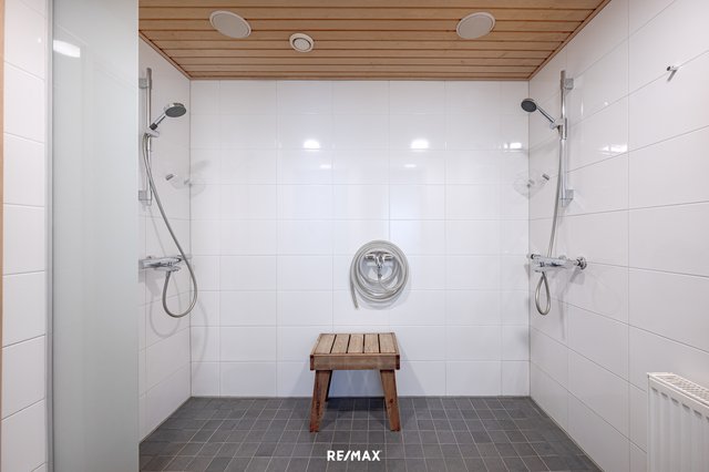 - WC-istuin, pesukoneliitäntä, suihkukaappi, lattialämmitys, peilikaappi, allaskaappi, ja pyyhepatteri
