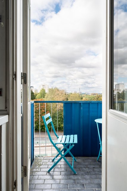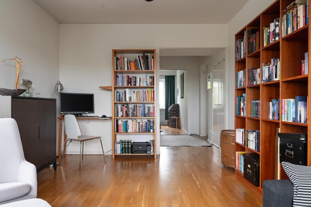 - Avara olohuone, jonka ikkunat kahteen suuntaan länteen ja pohjoiseen. Vapaat näkymät Paavalinkirkon ja Vallilan siirtolapuutarhan sekä Vallilan laakson ja Toukolan suuntaan. Seinät maalattu, parkettilattia. Olohuoneesta on käynti avoparvekkeelle.