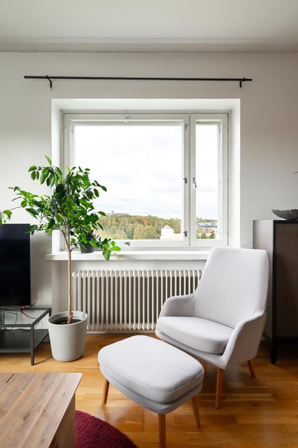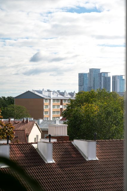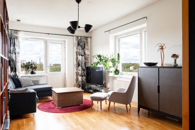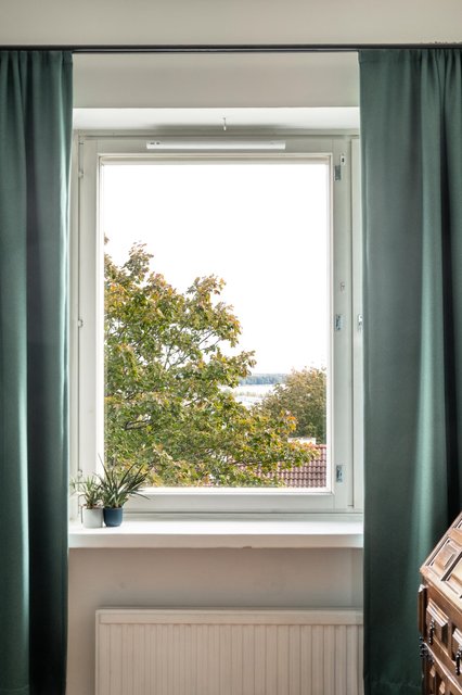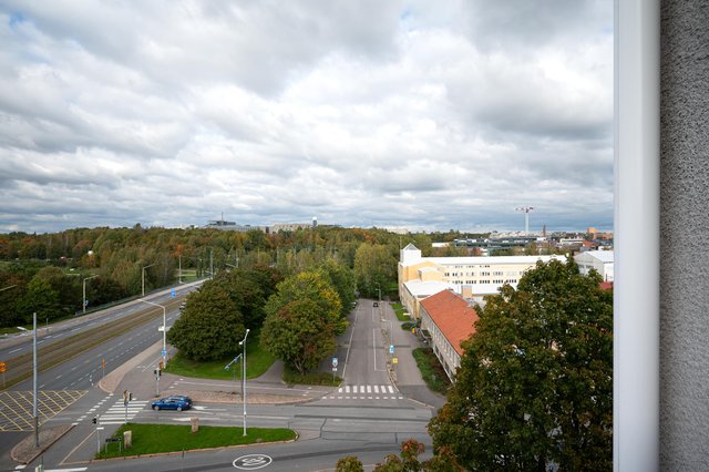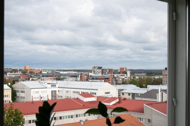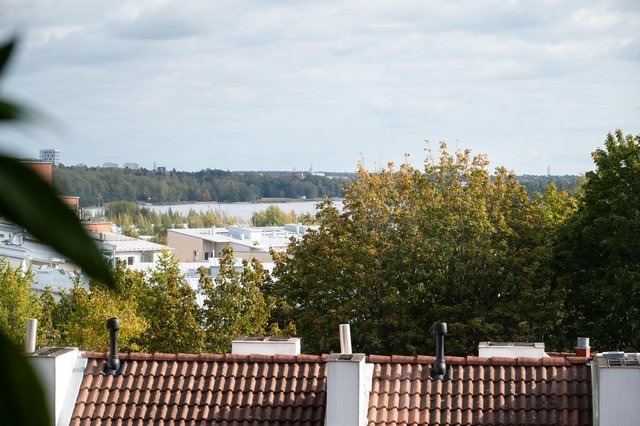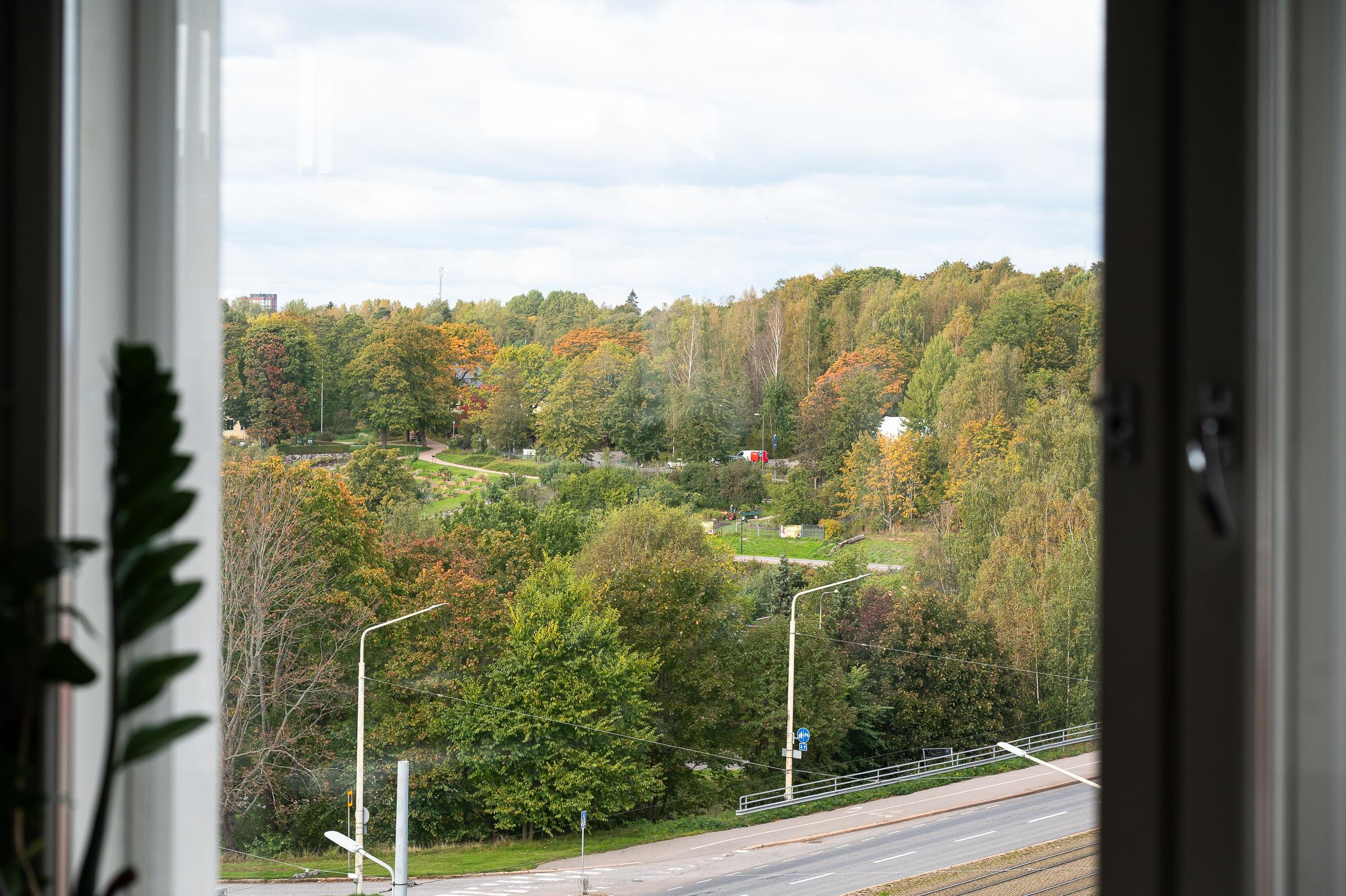 Ylimmän kuudennen kerroksen päätyasunnon kolmeen suuntaan avautuvat ikkunat tuovat päivänkulun mukaan vaihtuvan upean valon ja tarjoavat esteettömät näkymät yli vaihtelevan maiseman ja kaupungin kattojen. Olohuoneen ikkunoista avautuvat sykähdyttävän kauniit auringonlaskut. Jokainen vuodenaika maalaa oman maisemansa: kevään orastava vaaleanvihreä, kesän täyteläinen tummanvihreä, syksyn värikylläinen ruska ja talven lumipeite - tai paljaat tumman puhuvat puiden rungot, joita valaiset asettamalla ikkunapenkeille kynttilöitä!
