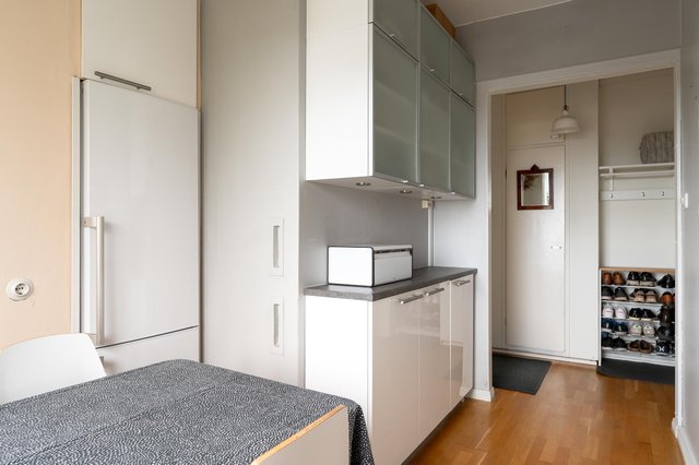 - Erillinen keittiö, jossa tila ruokapöydälle. Ikkunat itään ja näkymät Vanhankaupunginlahden suuntaan. Varusteet: jääkaappi/pakastin, astianpesukone, induktiotasoliesi, liesituuletin ja kalusteisiin upotettu erillisuuni. Työtasot (kovapintainen materiaali), induktioliesi ja erillisuuni uusittu 2020. Parkettilattia. Seinät maalattu, kaapistojen välitila laattaa.