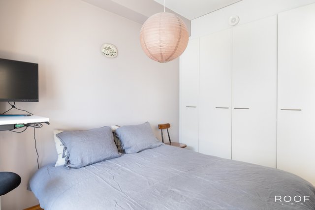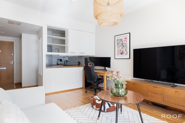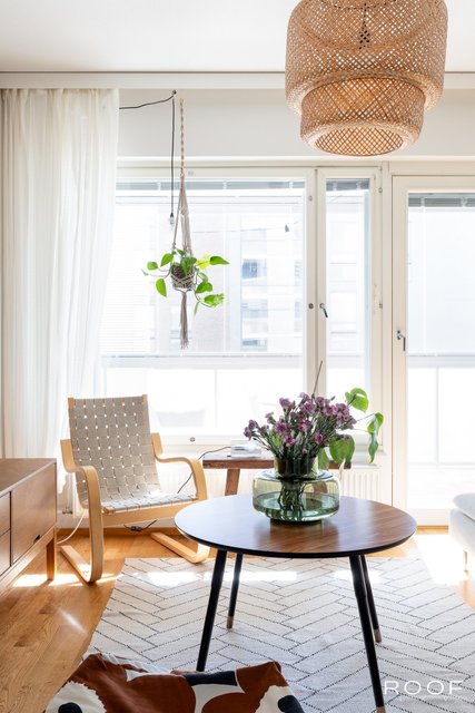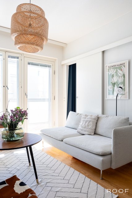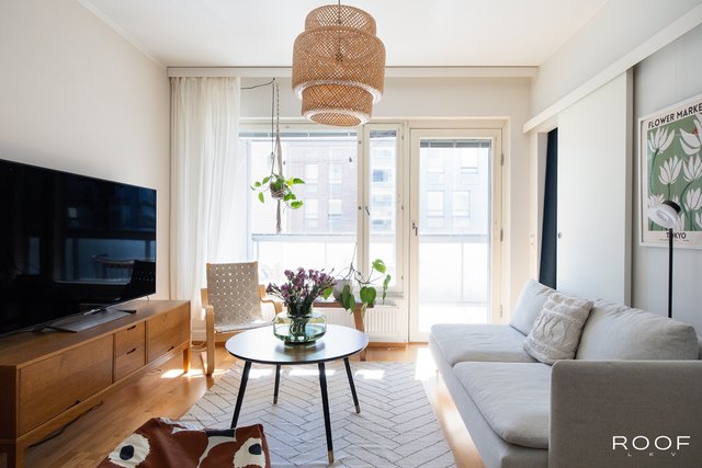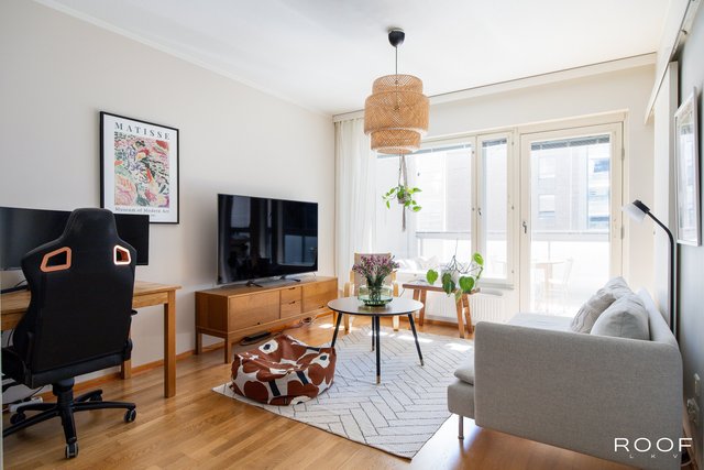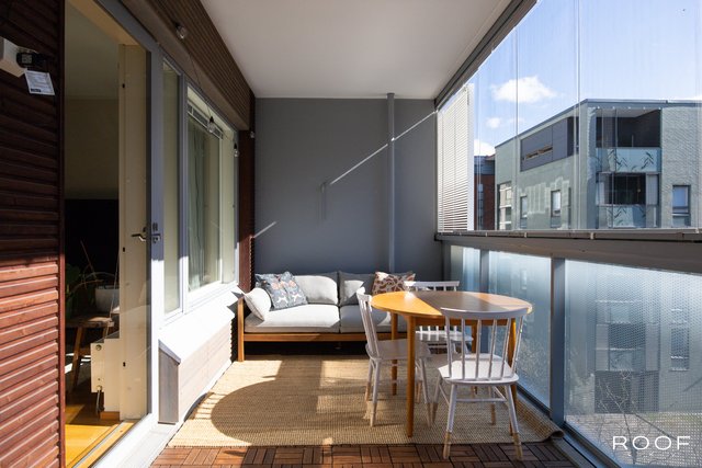 Olohuone on avara ja valoisa. Olohuoneesta astut suurelle koko asunnon levyiselle lasitetulle parvekkeelle, joka on täydellinen paikka aamukahveille tai rentoutumiseen illalla. Lämpimällä säällä parveke toimii kätevästi myös työhuoneena. Makuuhuone on erotettu olohuoneesta kahdella liukuovella ja seinustalta löytyy runsaasti säilytystilaa.