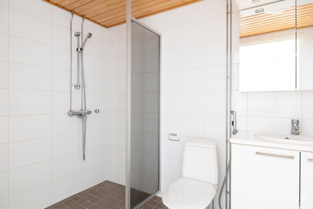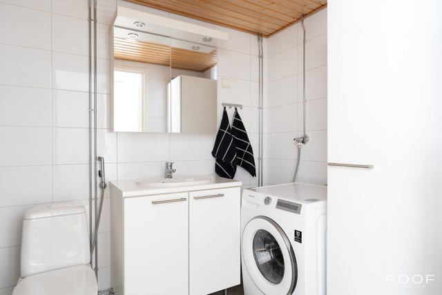 - SEINÄT: Laatta LATTIA: Laatta VARUSTELU: Suihku, suihkuseinä, wc istuin, pesukoneliitäntä, hana, allas, peilikaappi, allaskaapisto, lattialämmitys.